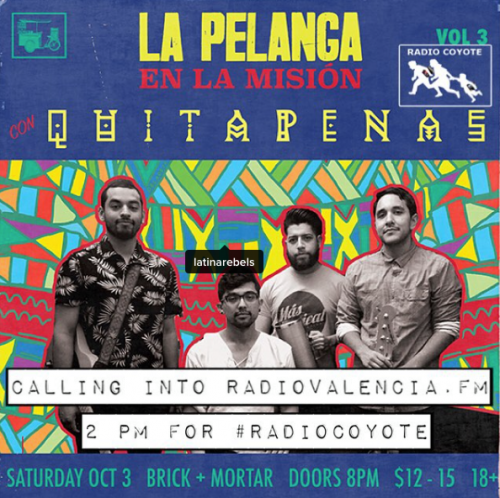 This week on Radio Coyote, we got #MasTropical with Eddie Valencia of Riverside's very own QUITAPENAS. The group was in town for the 2nd Annual thrown by Social Justice Initiative and also for La Pelanga's monthly events in the Mission. We also take you an a journey of sound with music from Will Smith's discovery of Bomba Estereo (been there, Will!), to Chicano Batman, Fantastic Negrito, and even Erykah Badu's flip of Drake. Radio Coyote - smuggling diasporadical sounds across borders every Friday from 2 - 4 PM PST on www.radiovalencia.fm.