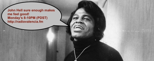 But do not be alarmed, this Monday night, 8-10PM (PDST) I will be playing two hours of James Brown and James Brown-related material. So get your funky dance shoes ready to groove. Get on with your bad self, because John Hell will have you gettin' up on the get down Monday night at 8.